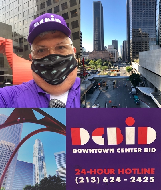 Due to the Pandemic’s negative impact on the local, domestic and international tourism industries, the previous high volume of my freelance tour assignments did not entirely disappear, but greatly diminished which prompted me to accept a new role as an Ambassador Guide for the Downtown Center Business Improvement District as contracted by the Allied Universal company. The DCBID provides instrumental police-on-bicycle and sidewalk cleaning services throughout the prominent western sector of downtown Los Angeles–from Olympic Boulevard to the Walt Disney Concert Hall. Its sidewalk cleaning division is in partnership with the downtown Chrysalis organization and uniquely provides opportunities for some of the more disenfranchised members of our community (including homeless, recently incarcerated and others) to re-enter the workforce and regain stability in their lives while providing a major needed public service.